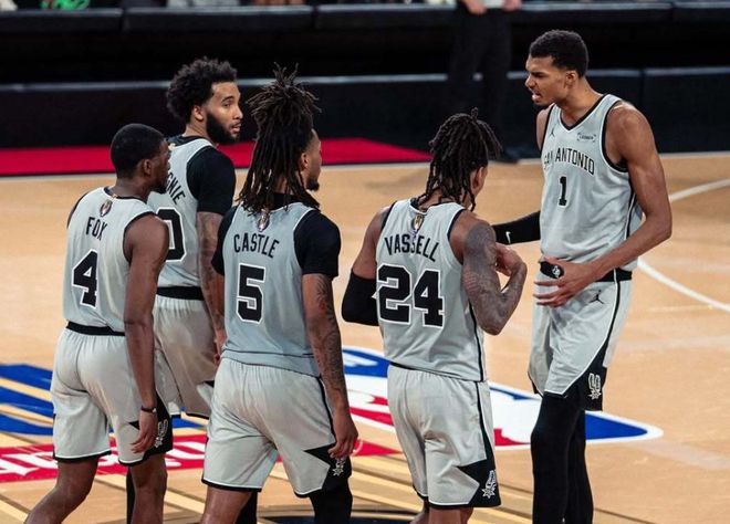 有两个数据值得深思,马刺这套非常规的首发,福克斯+瓦塞尔+卡斯尔+巴恩斯+科内特,百回合能赢对手10.3分;马刺出战最多的一套正常首发:瓦塞尔+尚帕尼+卡斯尔+巴恩斯+文班,百回合能赢对手12.9分!也就是说马刺在过去几个赛季,优中选优,边缘化凯尔登约翰逊+索汉等人后,他们已经形成了新的崛起框架,文班亚马+卡斯尔+瓦塞尔+哈珀代表着球队的未来,卡斯尔当选过最佳新秀,文班亚马也当选过最佳新秀,还有榜眼哈珀随时能在逆境挺身而出,这套阵容上限可太高了。